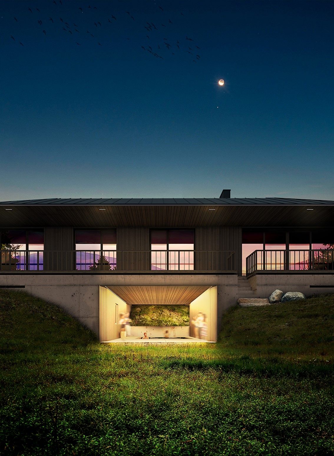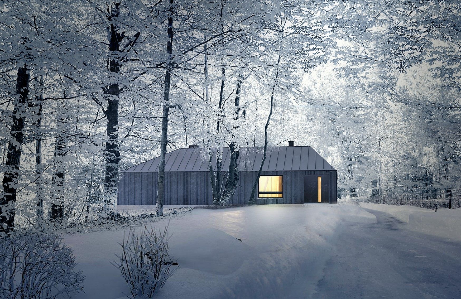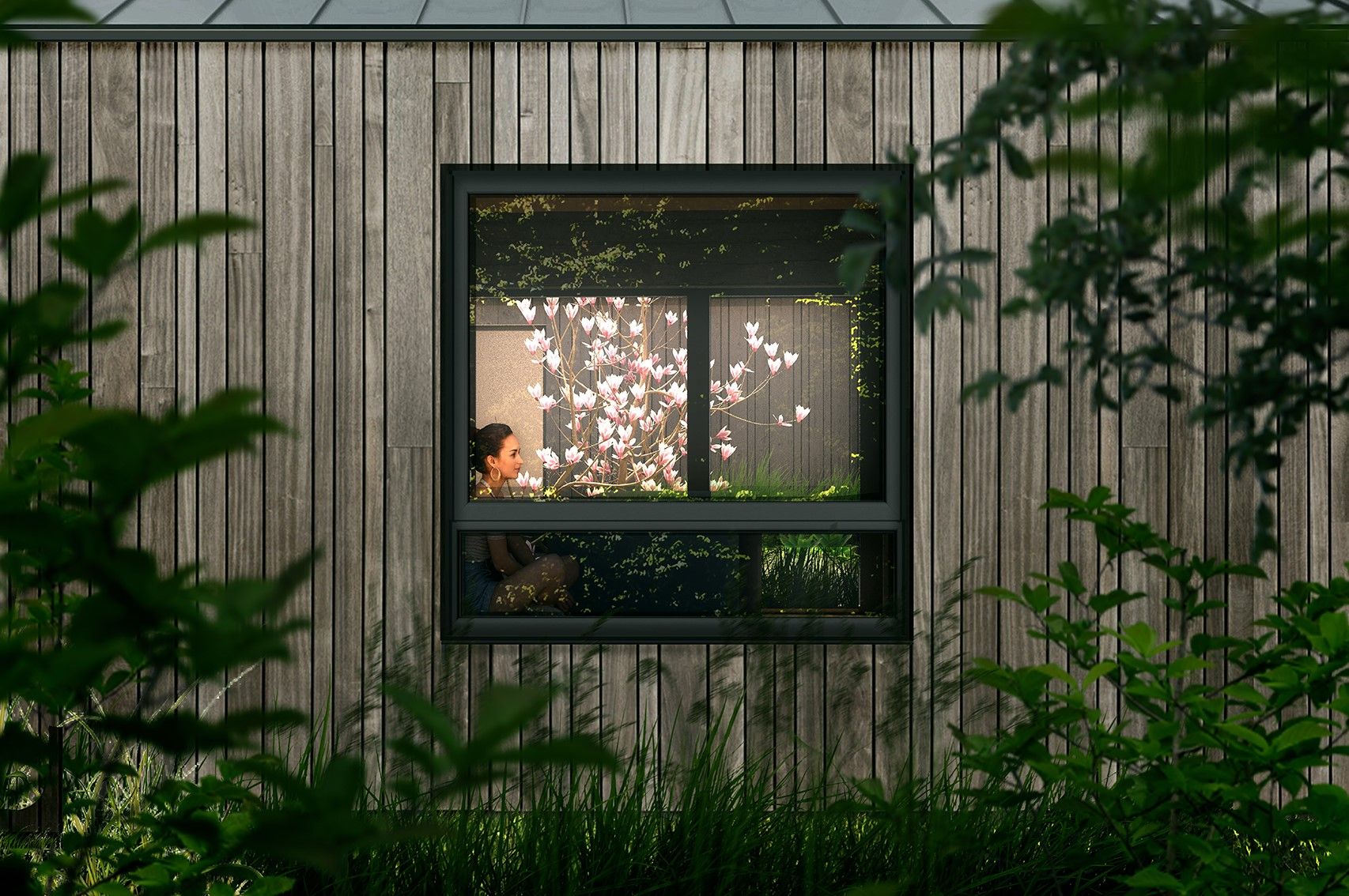 W.Ś: Duże przeszklenia to zasadniczy element, żeby tę relację z otoczeniem nawiązać. Oczywiście można podejść zupełnie na przekór i wymyślić sobie dom, który nas izoluje od otoczenia po to, żeby wymusić na nas aktywne wyjście do przyrody, ale z tak niebywale pięknym otoczeniem byłby to po prostu błąd. Mieliśmy różne myśli, jak ten dom rozwiązać, w kwestii jego wielkości przechodziły nam również przez głowę koncepcje, które mieściły się w stu paru metrach kwadratowych. Natomiast perspektywa odwiedzających nas gości, czy rozrastającej się rodziny, skłoniła nas do myślenia zapewniającego odpowiedź na więcej okoliczności. Te pierwsze koncepcje to był raczej dom, który był szeroki wobec widoku, a wąski w drugim wymiarze, domykał naszą prywatną łąkę z pomocą ramion lasu. Istotną dla docelowego projektu sprawą było poczucie wygody i bezpieczeństwa, jakie chcieliśmy sobie zagwarantować. Sprawy potoczyły się tak, że skromniejsze w skali rozwiązania zestawiły się z oczywistą w tych okolicznościach – i będącą punktem ciężkości, naturą, pozwalając nam sfinalizować myślenie o naszym domu. Dość mocno przeszklona elewacja od strony widoku, mieści wszystkie sypialnie i pokój dzienny, które korzystają z tego fantastycznego otwarcia. W kontekście natury istotną przestrzenią jest zielone atrium, całkowicie otwarte od strony polany na niższym poziomie – pozwalające wejść zieleni i powietrzu do środka i „wyrastając” wewnątrz domu niczym wielka zielona donica. Ta zieleń jest obecna w każdym wnętrzu, jest obecna w pokoju gościnnym, jest obecna od strony wszystkich sypialni i od pokoju dziennego. Więc jest wszędzie, jest zawsze, da się na nią również wyjść, skorzystać z niej, wszystko dzięki pełnym przeszkleniom wokół atrium właśnie. Oczywiście zieleni jeszcze nie ma, ale po montażu stolarki nasza wyobraźnia ma wystarczająco dużo paliwa, by wspomniane wcześniej scenariusze zacząć sobie budować. Dzięki współpracy i wdrożeniu oczekiwanych rozwiązań, podtrzymujemy fundamentalne dla naszej koncepcji kwestie – utrzymujemy związek z zielenią, otwarcie na szeroki widok, dystans, który ma terapeutyczne działanie, ale również uczestniczymy w unikalnym, kameralnym doświadczeniu, kontakcie „na dotyk” z przyrodą.