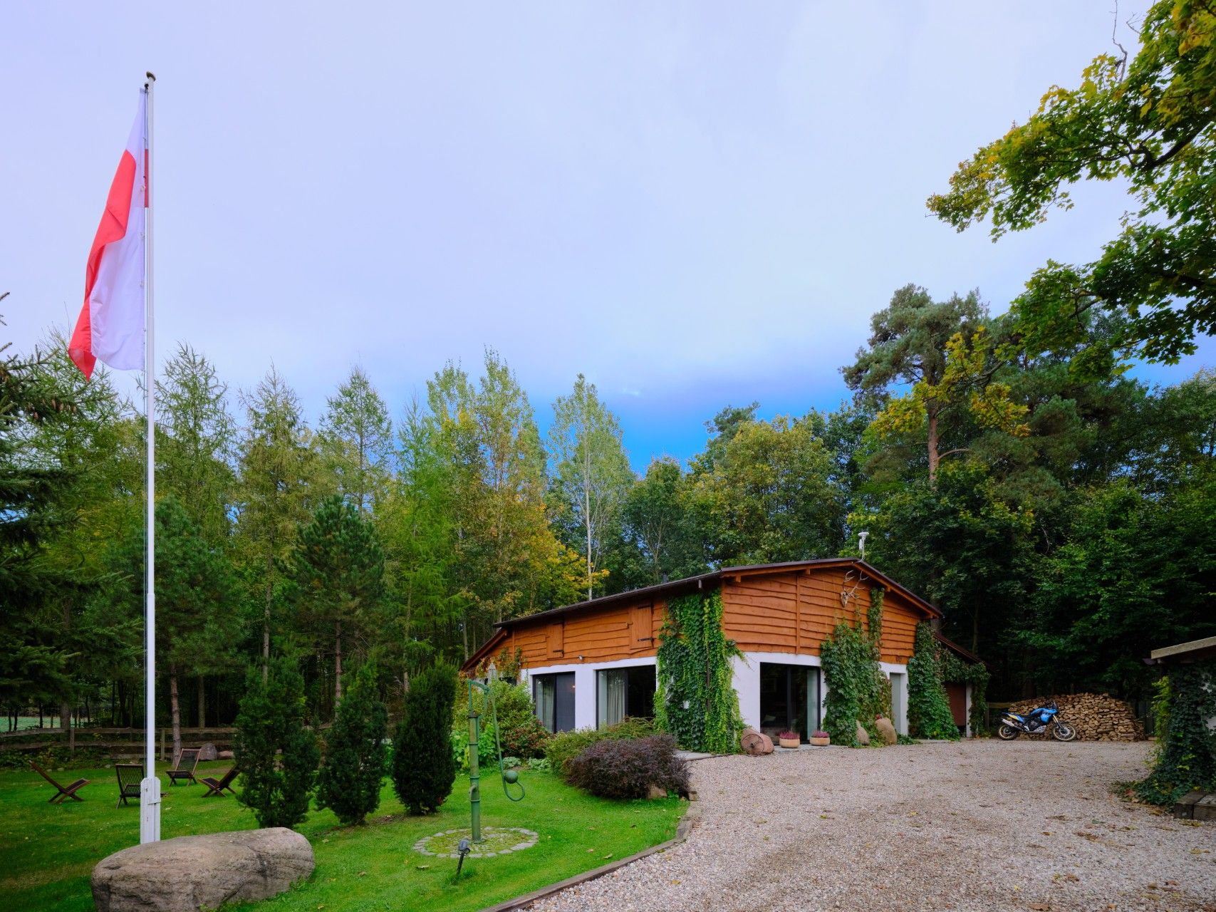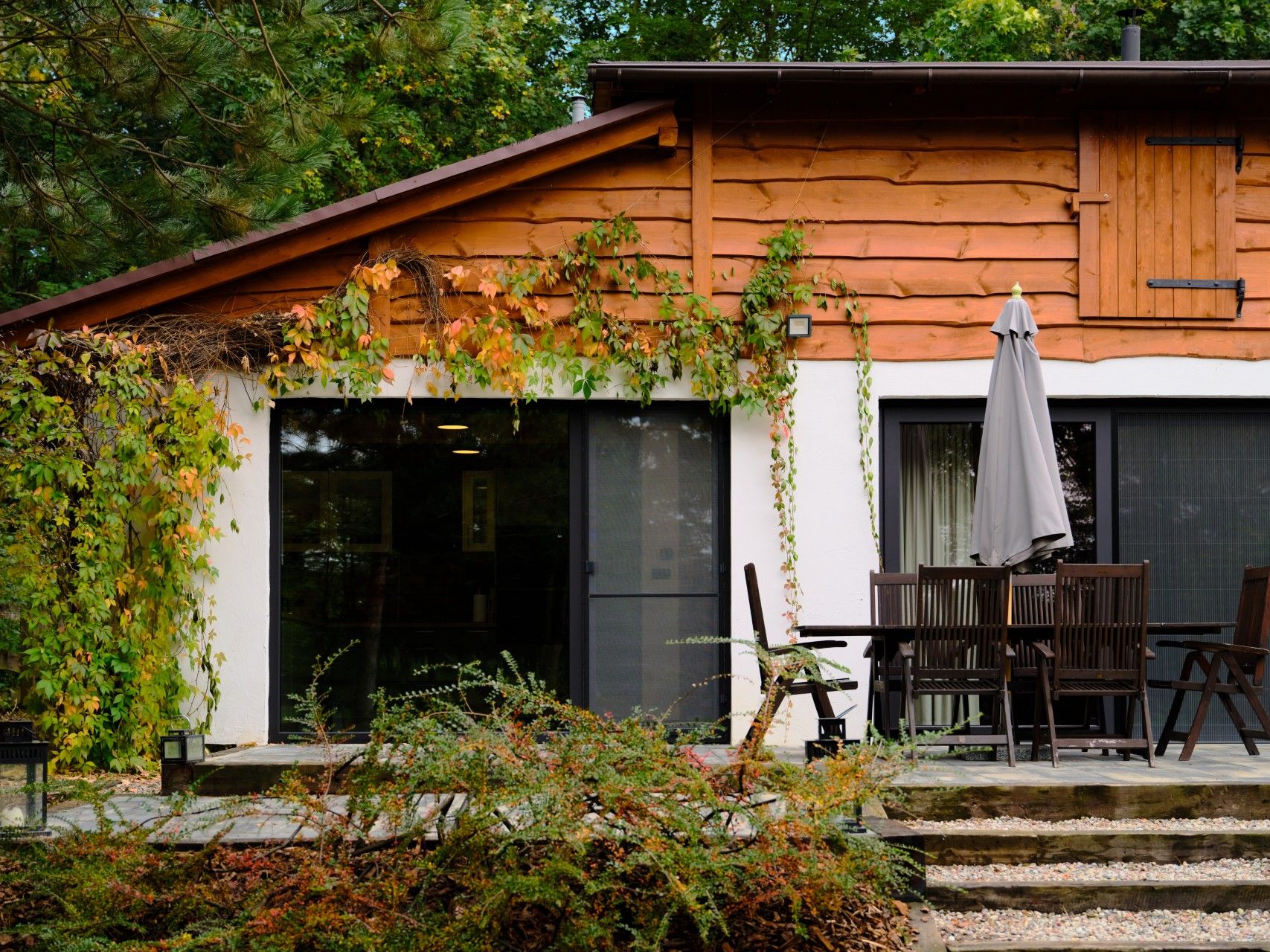 Otoczenie domu to ogród w stylu angielskim – swobodny, lekko dziki, płynnie łączący się z sadem i lasem. Latem pachnie tu dojrzałymi owocami, jesienią grzybami, a zimą ciszą przerywaną jedynie skrzypieniem śniegu pod stopami.