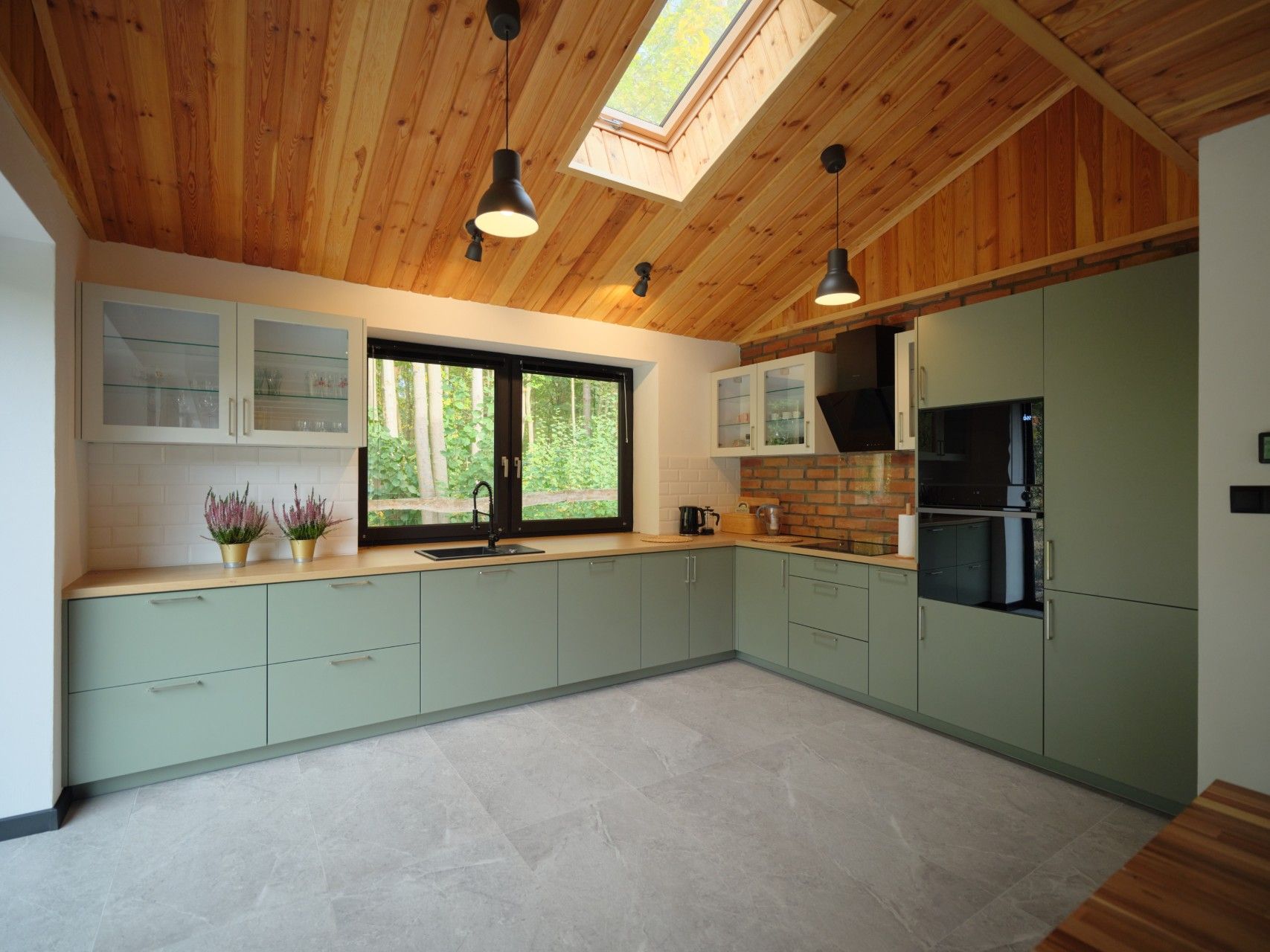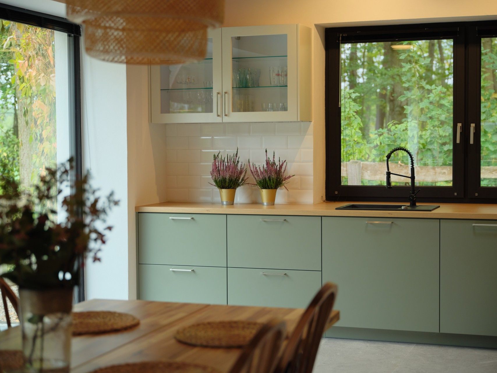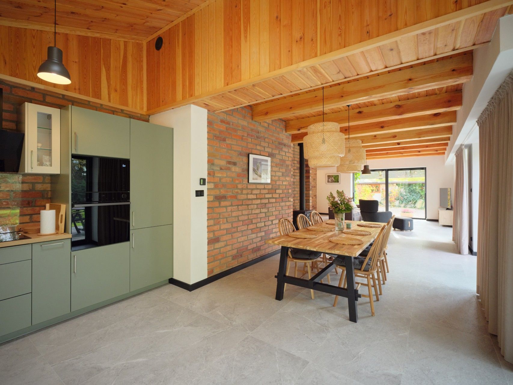 Wejście do domu to osobny rozdział tej historii. Zielone drzwi CREO wzór 411 od WIŚNIOWSKI, w odcieniu HI willow green, są niczym zaproszenie do środka – kolor nawiązuje do barw ogrodu i otaczających łąk. Szyba w drzwiach wprowadza subtelny akcent światła, a ich solidna konstrukcja sprawia, że wewnątrz panuje cisza i komfort termiczny przez cały rok. Tak dobre parametry izolacyjne pozwoliły właścicielom zrezygnować z dodatkowych drzwi wewnętrznych do salonu, zachowując otwartą, swobodną przestrzeń.