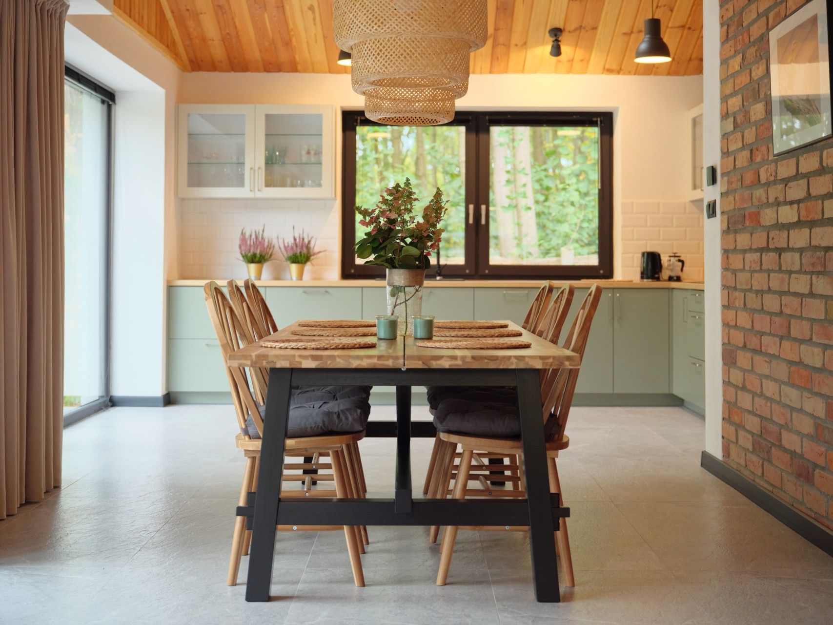 Ciepło wnętrza tworzą drewniane belki, ręcznie murowane ściany z cegły i naturalne tkaniny. To przestrzeń, w której architektura nie konkuruje z krajobrazem, lecz pozwala mu grać pierwsze skrzypce.