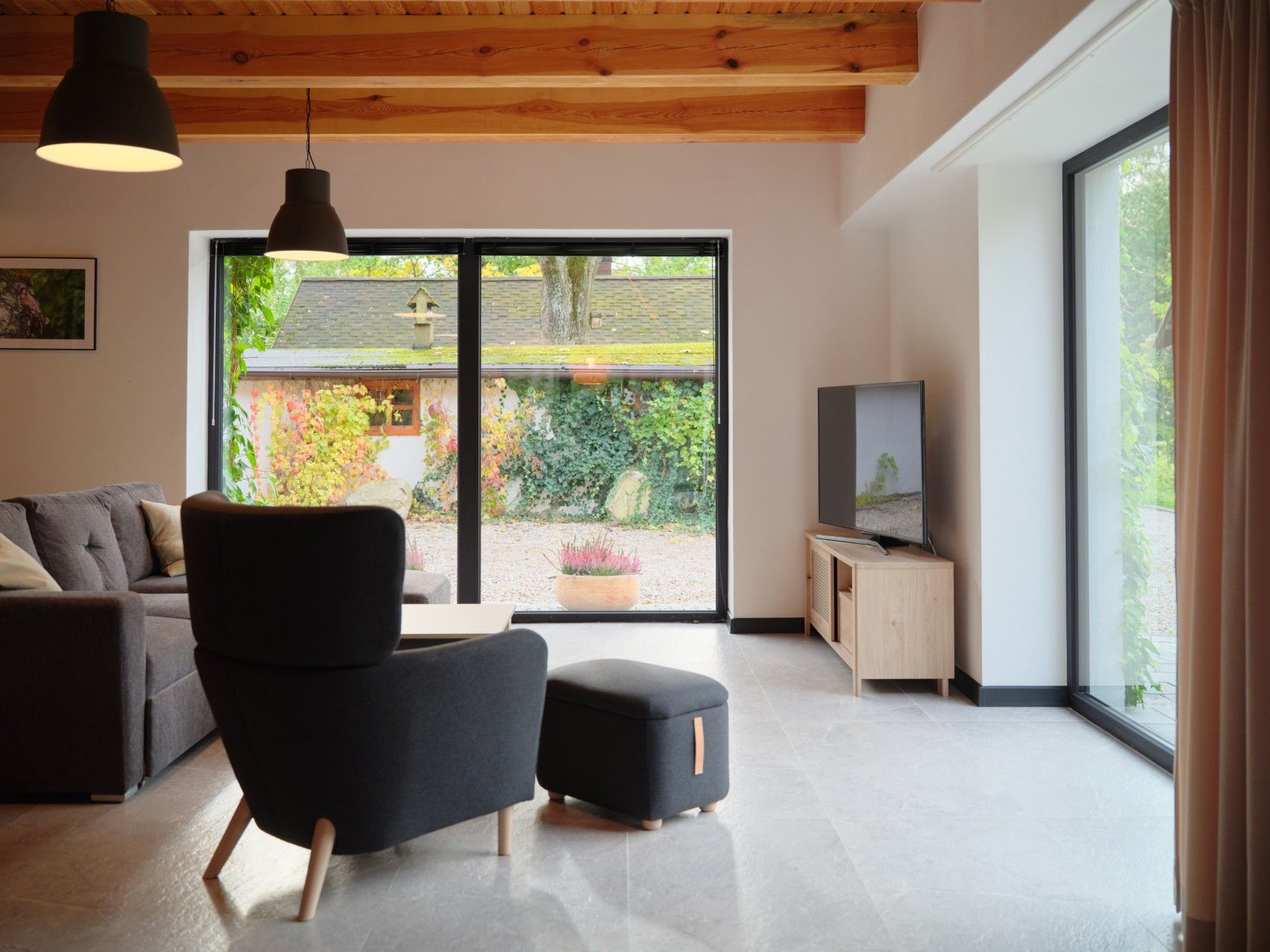 Kluczową rolę w projekcie odgrywają przeszklenia. Duże, panoramiczne okna PVC PRIMO oraz drzwi tarasowe HST PVC w eleganckim odcieniu antracytu (7016) otwierają dom na ogród i las, wpuszczając do środka nie tylko światło, ale i widok starych jabłoni, czereśni oraz dzikiej przyrody zaglądającej pod sam taras. Dzięki nim granica między wnętrzem a zewnętrzem zaciera się – tu poranne mgły czy zachody słońca stają się częścią codziennego życia.