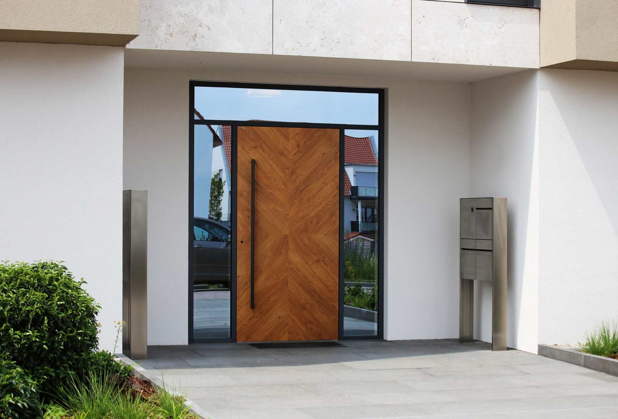 Klasyczna architektura wymaga bardziej stonowanych rozwiązań. Tu warto sięgnąć po subtelne doświetla boczne z mlecznym szkłem, które zapewniają prywatność, nie zakłócając przy tym harmonii fasady. Takie przeszklenia dodają lekkości, nie dominując wizualnie.