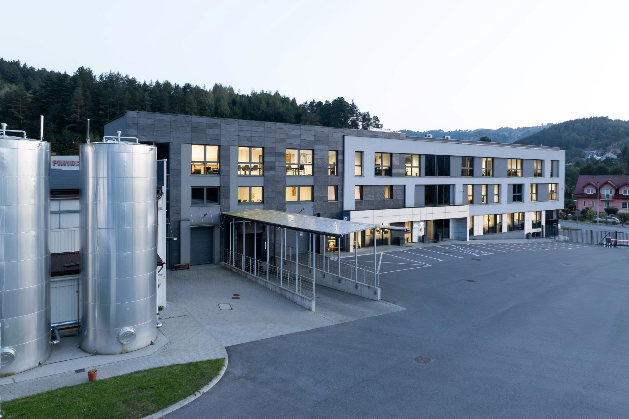 Prosta forma architektoniczna harmonijnie wpisuje się w naturalne otoczenie. Stonowana stylistyka budynku w różnych odcieniach szarości, oparta na liniach i figurach geometrycznych pozwala obiektowi współistnieć z krajobrazem, nie dominując go. Administracyjna część budynku zachwyca elegancją. Duże przeszklenia oferują panoramiczne widoki na górskie zbocza i sąsiadujące zabudowania, wprowadzając do pomieszczeń naturalne światło. Dzięki starannemu doborowi rozwiązań konstrukcyjnych i wykończeniowych rozlewnia stanowi przykład nowoczesnego obiektu przemysłowego, sprzyjającego koncentracji i komfortowi pracy – nawet w warunkach przemysłowych.