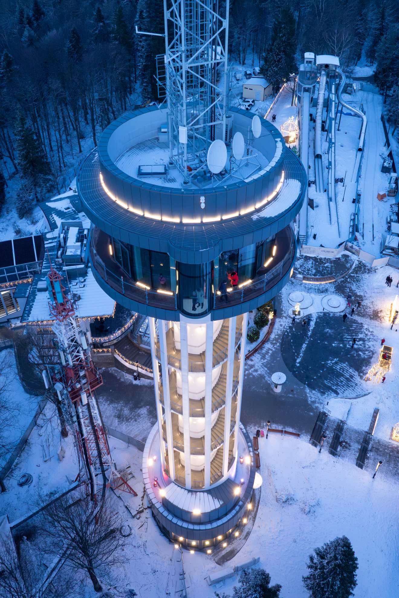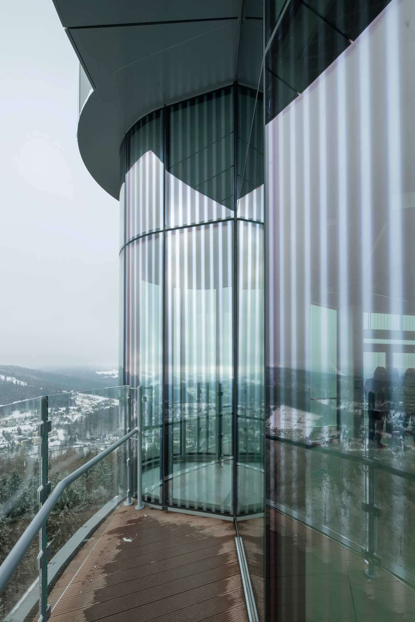 Centralnym elementem wieży jest przeszklony taras widokowy, częściowo osłaniający przed niekorzystnymi warunkami atmosferycznymi. Takie rozwiązanie umożliwia korzystanie z wieży przez cały rok, także przy wietrze czy niskich temperaturach, bez rezygnacji z bezpośredniego kontaktu z przestrzenią.