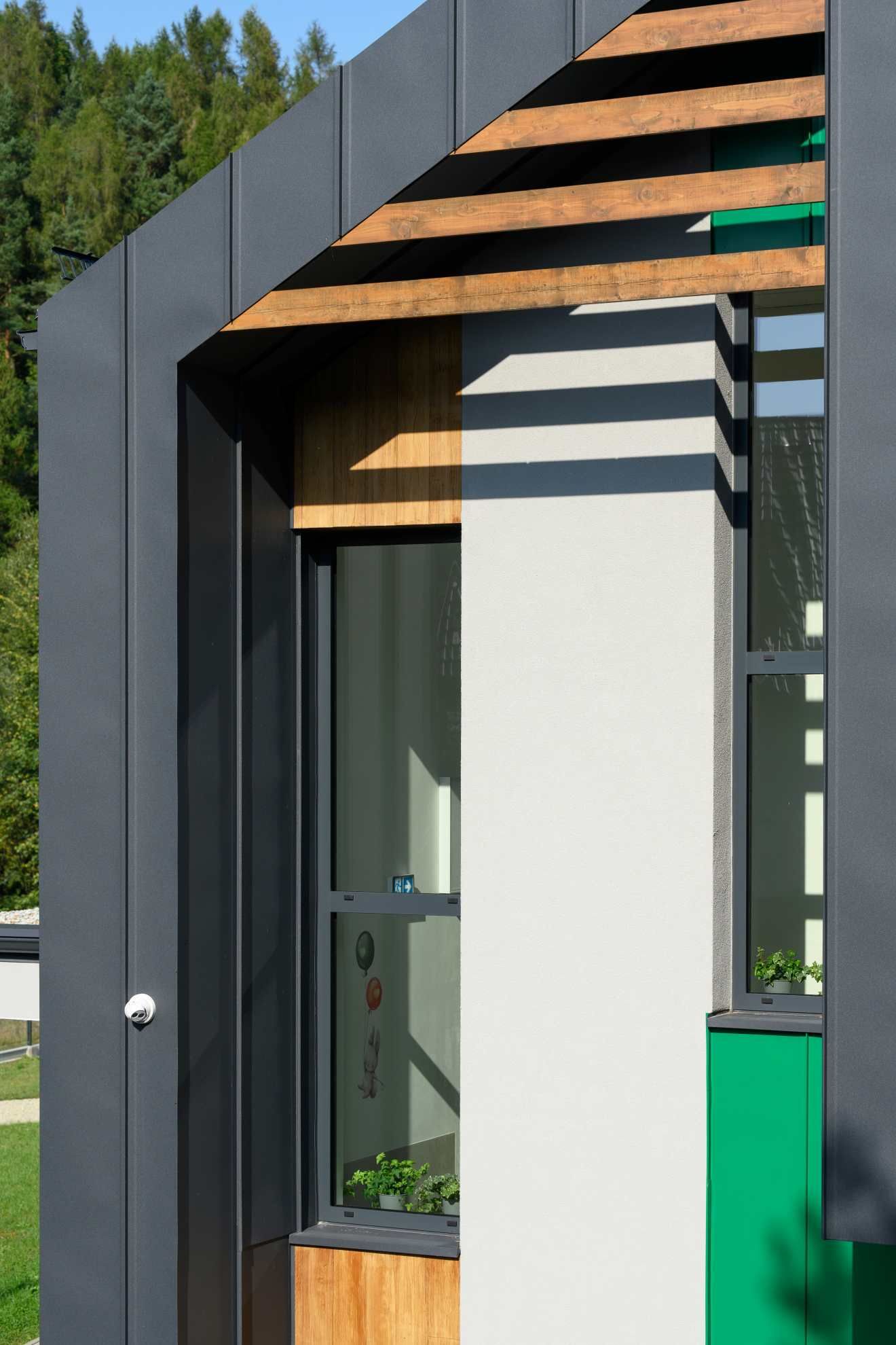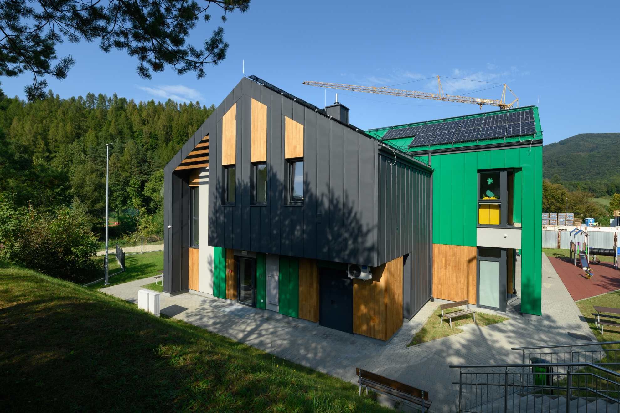 Bryła przedszkola, oparta na dwóch nowoczesnych segmentach o spadzistych dachach, nawiązuje do tradycyjnej zabudowy górskiej. Zastosowanie zielonych i grafitowych paneli elewacyjnych sprawia, że budynek wtapia się w otaczającą go zieleń i naturalną topografię terenu.
