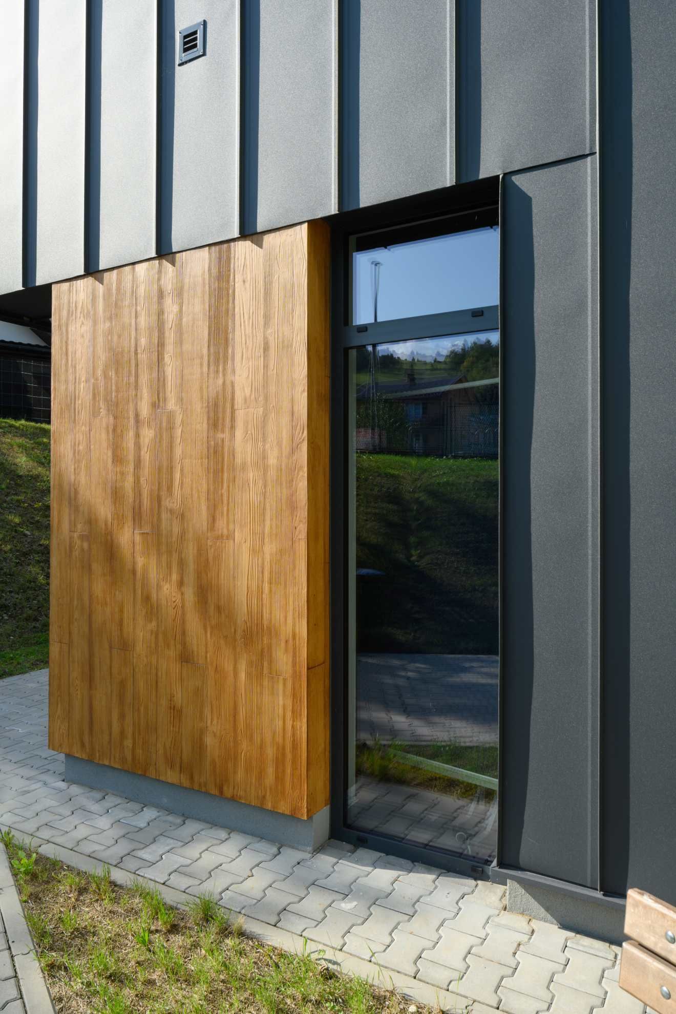 Zastosowany kolor profili w kolorze grafitowym (RAL 7016) podkreśla nowoczesny charakter budynku, a wysoka odporność aluminium na warunki atmosferyczne czyni stolarkę idealną do górskiego klimatu.