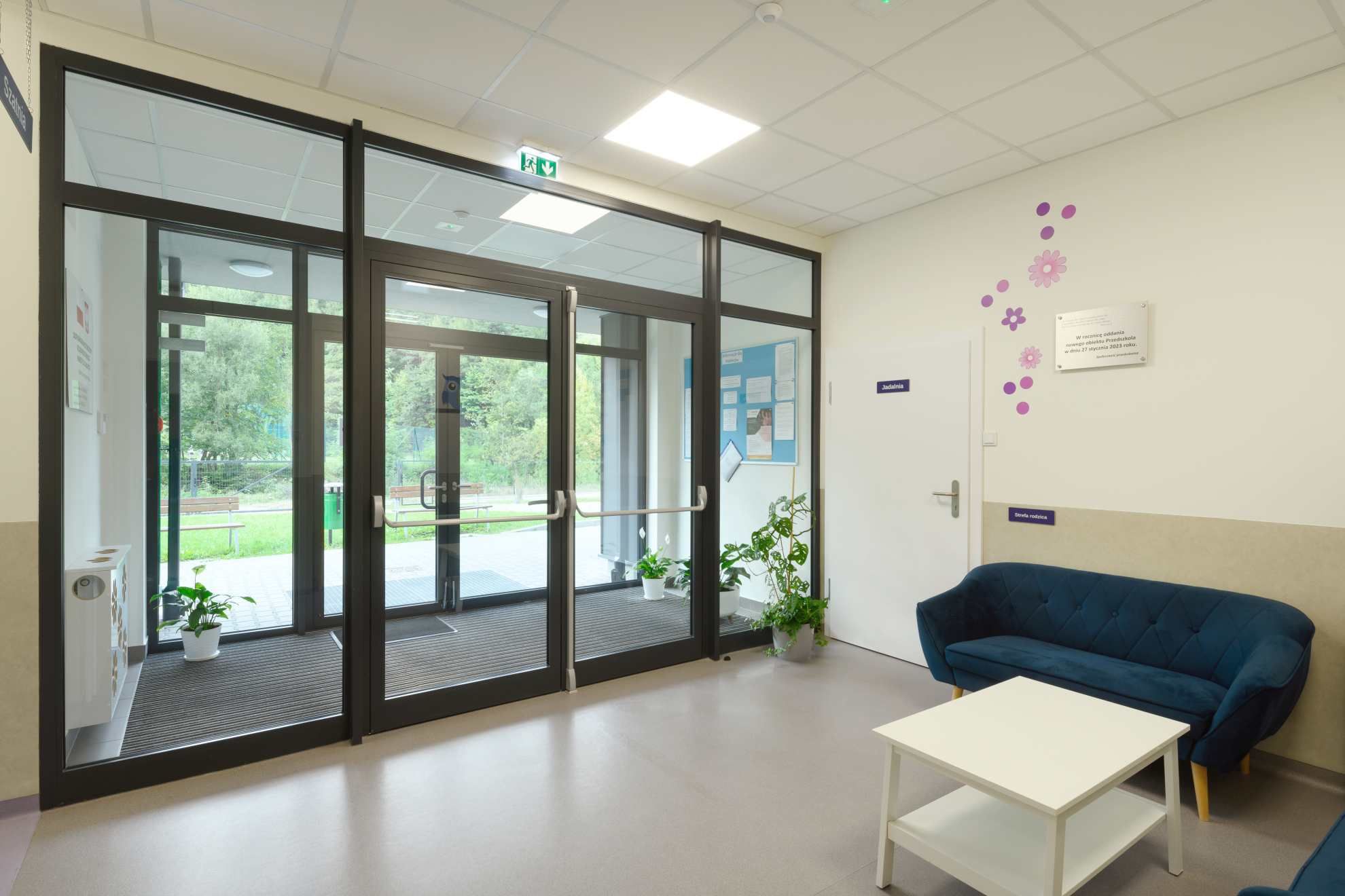 W przedszkolu zamontowano szereg drzwi wyposażonych w trzypunktowe zamki ewakuacyjne, samozamykacze ukryte, okucia anty-paniczne, a także rozwiązania z funkcją E (ewakuacyjną) oraz napowietrzania. Drzwi te zapewniają bezpieczną i szybką ewakuację oraz spełniają rygorystyczne wymagania dla obiektów edukacyjnych.