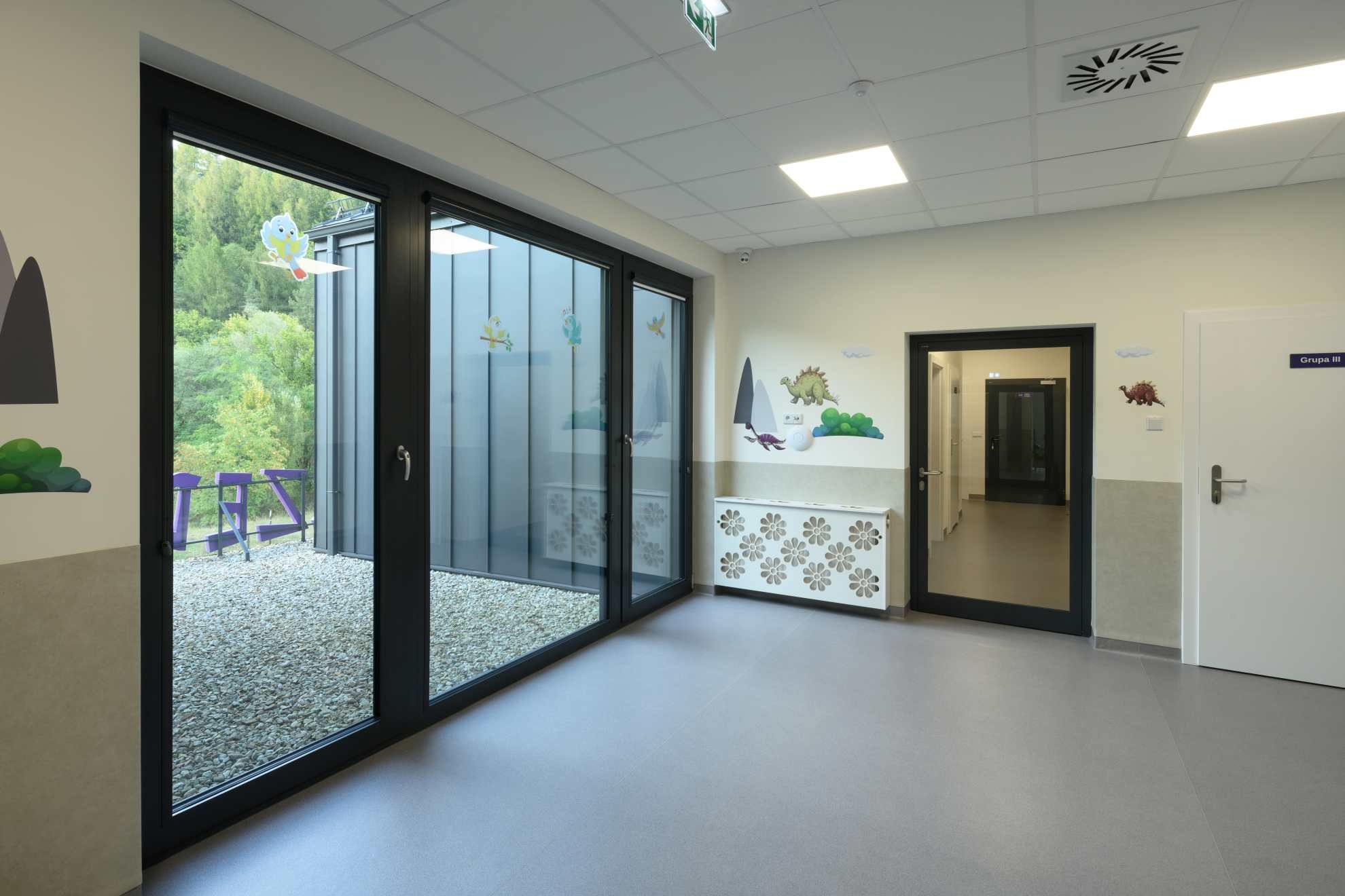 W całym obiekcie zastosowano szyby hartowane od zewnątrz i laminowane od wewnątrz (bezpieczne), co jest kluczowe w budynku przeznaczonym dla dzieci.